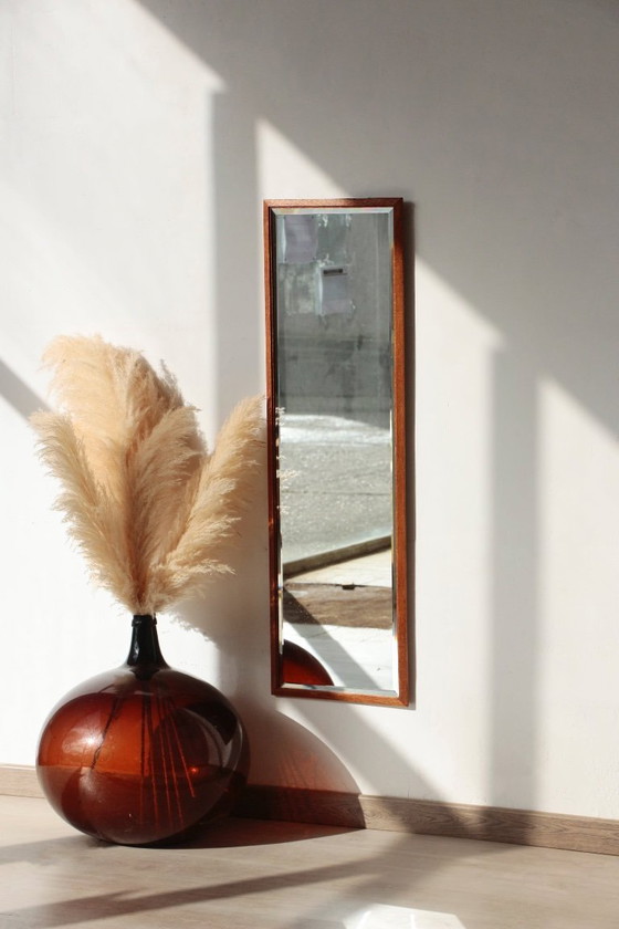 Superbe grand miroir biseauté au cadre en bois d’origine, entièrement poncé et huilé pour révéler la beauté naturelle du matériau. Ce miroir vintage des années 60 présente une glace légèrement piquée, signe du temps qui lui confère tout son charme et sa patine authentique.