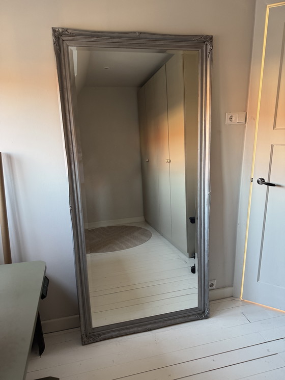 Un magnifique miroir de grande taille, encadré d'un élégant cadre argenté. Ce miroir attire tous les regards et trouvera parfaitement sa place dans une entrée, une chambre ou un salon. Son cadre, finement travaillé, lui confère une allure classique et raffinée. Dimensions : 195 x 94 cm.