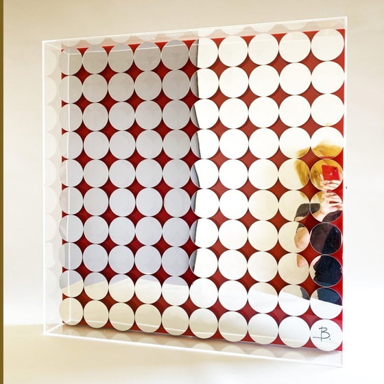 L'objet se compose d'un panneau de bois recouvert d'une plaque de plexiglas rouge, sur lequel sont collés 100 miroirs ronds. Légèrement inclinés, les miroirs fragmentent le reflet de l'environnement. Un boîtier en plexiglas transparent, également légèrement réfléchissant, entoure le panneau. Pièce unique, l'objet est signé « B » en bas à droite. Le dos est muni d'une étiquette autocollante.