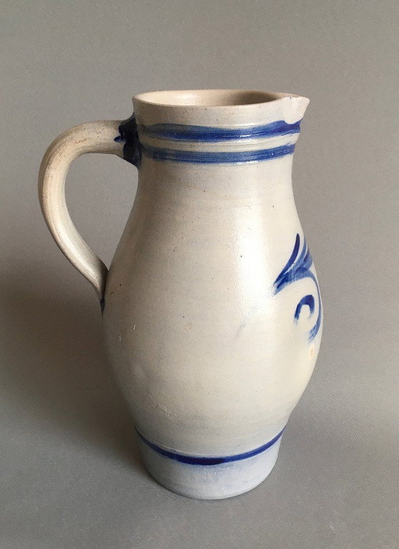Pichet à eau de Cologne en faïence grise à décor bleu cobalt, en très bon état.