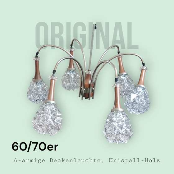 Ce superbe plafonnier à six bras des années 60/70 allie élégance et fonctionnalité. L'alliance du bois et du verre cristallin crée une ambiance chaleureuse et accueillante dans n'importe quelle pièce.