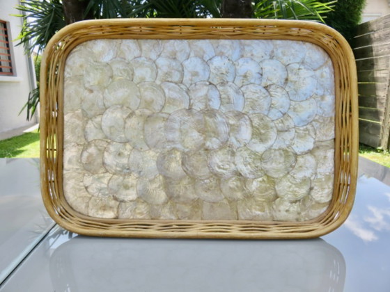 Grand plateau en nacre Capiz des Philippines, entourage en rotin, osier. Années 70. Très belle qualité de nacre légèrement ambrée. Longueur 50cm. Largeur 34cm. Hauteur 4cm. Excellent état.