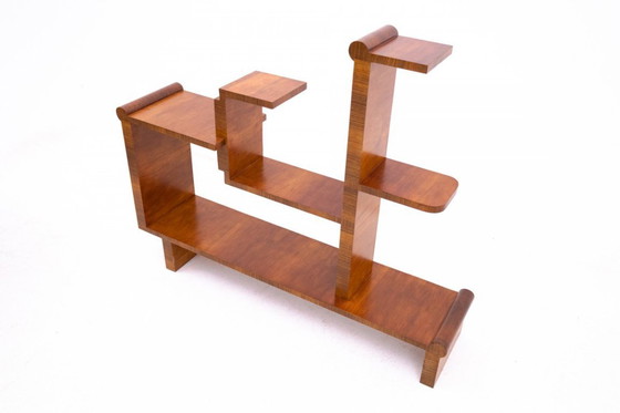 Porte-fleurs de forme géométrique caractéristique du style Art Déco. Le porte-fleurs est entièrement plaqué de noyer. Il est idéal pour présenter des fleurs ou des décorations diverses.