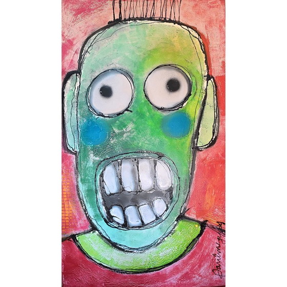 Le visage du personnage central, d'un bleu-vert profond, est dessiné par des traits noirs, rugueux et esquissés. Ses grands yeux ronds et grands ouverts évoquent la surprise, la tension, voire une légère folie. Ils captent immédiatement le regard et confèrent à l'œuvre une apparence presque hypnotique. La bouche, grande ouverte, laisse apparaître des dents irrégulières et fortement accentuées, comme si le personnage hurlait ou chantait à pleins poumons.