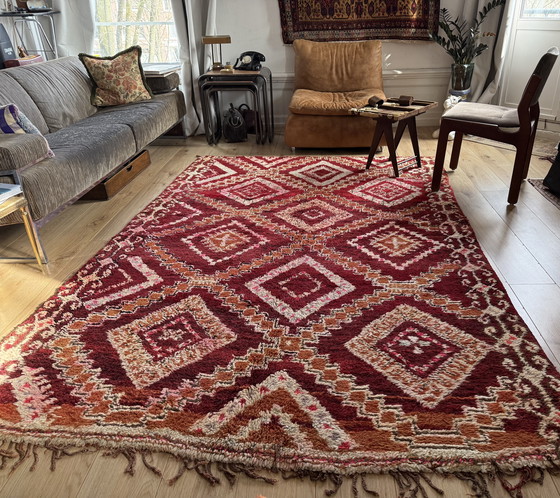 Un tapis vintage audacieux et chaleureux, orné d'un motif losange imposant dans des tons bordeaux profond, terracotta et crème. Son velours épais et dense lui confère une présence et un volume remarquables.