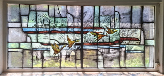 Grand vitrail des années 1970. En excellent état, il représente un vol de canards sur l'eau. À l'arrière-plan, on aperçoit un petit village. Disponible début juin.