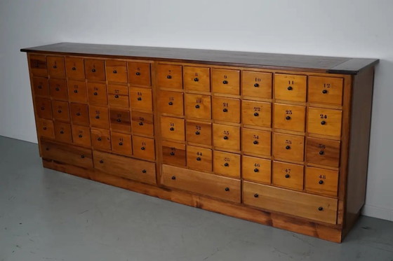 Cette armoire d'apothicaire à tiroirs a été conçue et fabriquée aux Pays-Bas vers 1950. Fabriquée en hêtre, elle comporte 52 tiroirs avec boutons en métal noir et poignées numérotées. Dimensions intérieures des tiroirs : P x l x H : 33 x 14,5 cm et 52 x 13 cm.