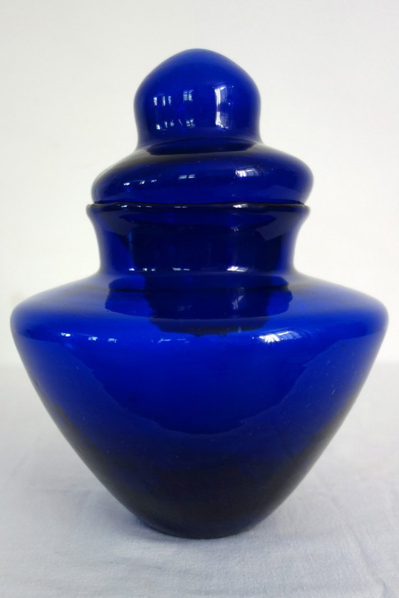 Grande bonbonnière en verre bleu cobalt légèrement bullée. Période art déco, soufflé à la main.