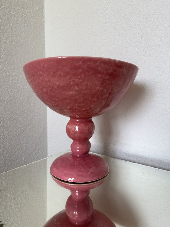 Superbe grande coupe sur pied, une des dernières pièces de forme de la célèbre faïencerie de Digoin/FRANCE (aujourd’hui en cessation d’activité totale et pourtant en activité depuis le 19ème…); sublime émail rose richement pigmenté et subtilement moucheté; excellent état