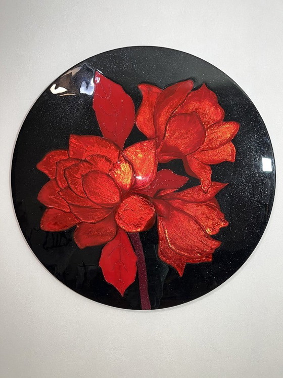 Cette magnifique décoration murale ronde (100 cm / 39,37 pouces) présente des fleurs rouges texturées et éclatantes, réalisées en pâte à modeler, peintes à la main à la peinture à l'huile et rehaussées de véritables feuilles d'or. L'ensemble est recouvert d'une résine transparente pour une finition brillante et luxueuse. Le fond noir profond met en valeur le motif floral spectaculaire, faisant de cette œuvre une pièce maîtresse remarquable pour tout intérieur moderne.