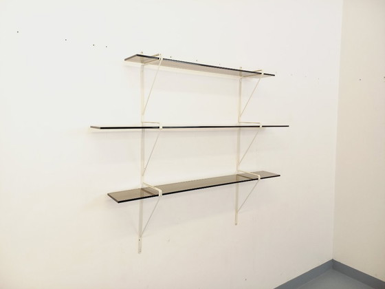 Grande étagère murale vintage en verre fumé et métal blanc style String Tomado des années 60