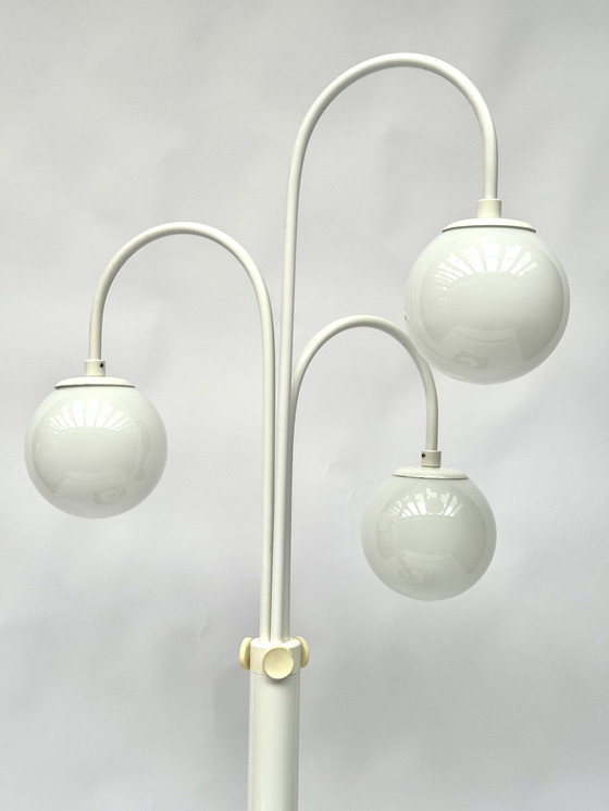 Lampe de table iconique de style cascade, ornée de trois globes en verre opalin. Design néerlandais expressif des années 1970/80, elle se distingue par son allure sculpturale et ludique. Réglable en hauteur, pivotante et flexible, elle offre deux intensités lumineuses, créant une lumière d'ambiance chaleureuse et diffuse.