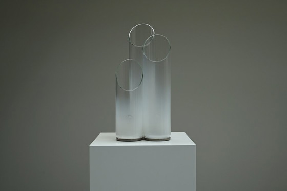 Grande lampe de table de Carlo Nason pour Mazzega, Italie, années 1960. Carlo Nason est un designer italien réputé pour son travail du verre, notamment dans la conception de luminaires utilisant le verre de Murano. Né en 1935 sur l'île de Murano, près de Venise, mondialement connue pour sa tradition verrière séculaire, il a collaboré avec plusieurs verriers au cours de sa carrière, mais est surtout associé à Mazzega, une verrerie basée à Murano. Cette lampe se compose de trois tubes en verre de Murano, transparents puis blancs, sur un socle en nickel. Élégante et impressionnante, elle permet de varier la composition lumineuse grâce à l'orientation des tubes. Elle fonctionne avec trois ampoules E14 et est équipée d'un variateur. En très bon état vintage.