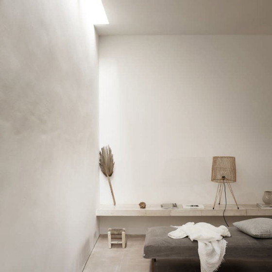 Il se compose de deux parties : un pied en fer à trois pieds recouvert de raphia et un abat-jour en raphia plissé. Ces deux pièces sont assemblées à l'aide d'un interrupteur en tissu noir.