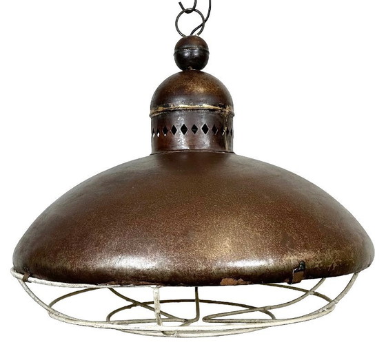 Lampe industrielle en métal avec grille en fer, fabriquée en Suède dans les années 1960. Câble neuf. Douille compatible avec les ampoules E27/E26. Diamètre de l'abat-jour : 53 cm. Poids : 1 kg.