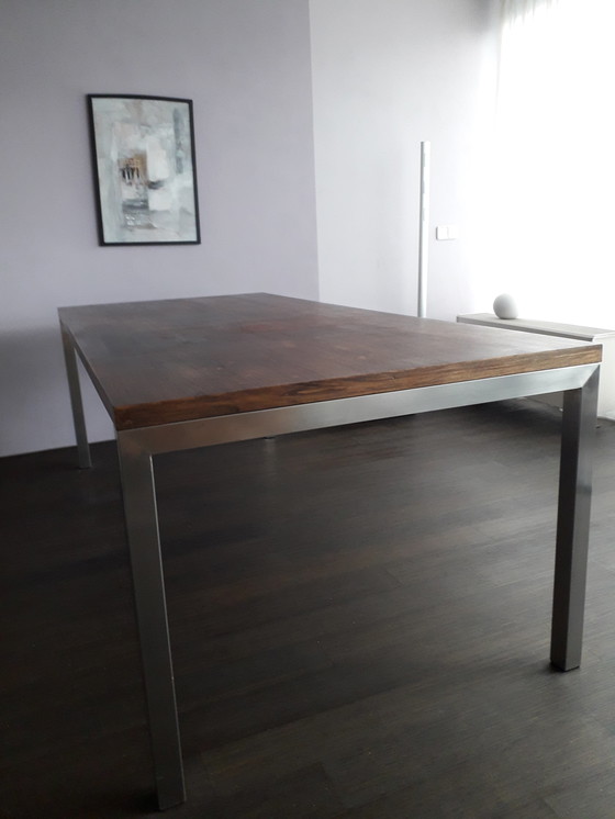 Grande table à manger en bois massif avec pieds en acier inoxydable