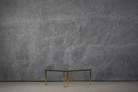 Une rare table basse vintage en bronze et verre signée Peter Ghyczy, alliant pieds en laiton massif et plateau en verre épais – disponible dès maintenant chez Retros Gallery.