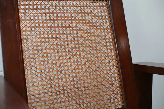 Paire de grands fauteuils en bois et cannage, circa 1960. Présence de 3 petits sauts de cannage. Le bois semble être peint d'origine en marron (traces, rayures, sauts de peinture). Les fauteuils grincent un peu, mais restent solides et stables. Assise profonde avec une hauteur d'assise de 31 cm. Design chic des années 60.