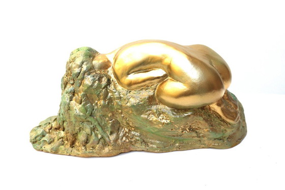 La femme nue est allongée, vulnérable et abandonnée, sur le rocher, où se noue sa longue chevelure. L'artiste illustre le lien de l'humanité avec la Terre Mère et notre grande vulnérabilité, tout comme la nature. L'or symbolise l'abondance et la force, mais grâce à la chaude lueur que dégage cette sculpture, il est aussi perçu comme une couleur ensoleillée, positive et exaltante. Cette sculpture apportera une dimension ensoleillée à votre environnement. Les différentes nuances de vert du rocher symbolisent la paix et la stabilité.
