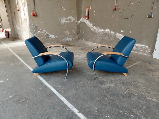 Découvrez le confort et l'élégance des fauteuils Gelderland 5470. Ces fauteuils vintage sont revêtus d'un cuir bleu de haute qualité et présentent une structure métallique raffinée avec des accoudoirs en bois.