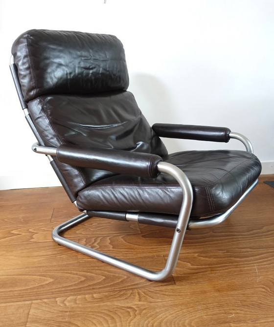 Fauteuil iconique « Meneer Oberman ». Modèle original de 1970, en bon état vintage. Revêtu de cuir marron de haute qualité, ce fauteuil dégage une élégance moderne qui s'intègre parfaitement à tout intérieur contemporain. Sa structure métallique lui confère à la fois robustesse et un style industriel raffiné. Conçu pour allier esthétique et confort, ce fauteuil est idéal pour votre salon ou votre bureau. Installez-vous confortablement et appréciez le luxe qu'il offre.