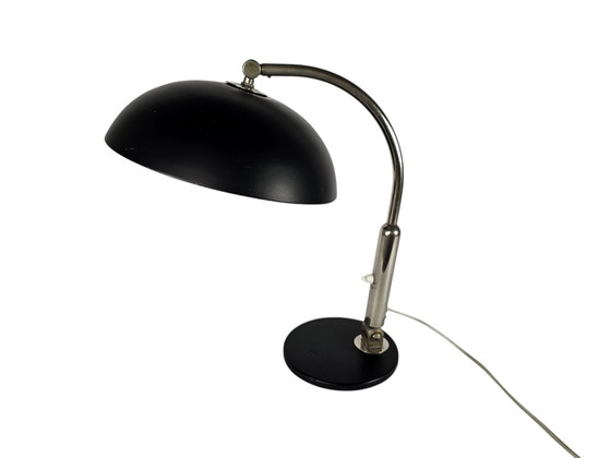 Fabricant : Hala Zeist Design : H.Th.A. Busquet Modèle : P-144 Dimensions : (hauteur) 43 x diamètre abat-jour 30,5 cm Provenance : Hollande, Zeist Matériau : métal, chrome Époque : années 1960 Électricité : prise E27 - interrupteur intégré - cordon de 150 cm - fiche européenne État : bon état - traces d'utilisation minimes - sur la base 2 petits points dans la laque - le reste est en bon état Noir mat Hala P-144 lampe de bureau conçue par H.Th.A. Busquet fabriquée dans les années 1960. La lampe est réglable en 2 points d'articulation. Lors de l'expédition, l'article sera soigneusement emballé pour éviter tout dommage.