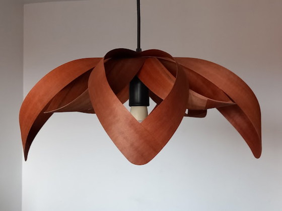 Hanging lamp is made of natural tineo wood veneer, with an E27 socket and an adjustable cable covered in fabric.