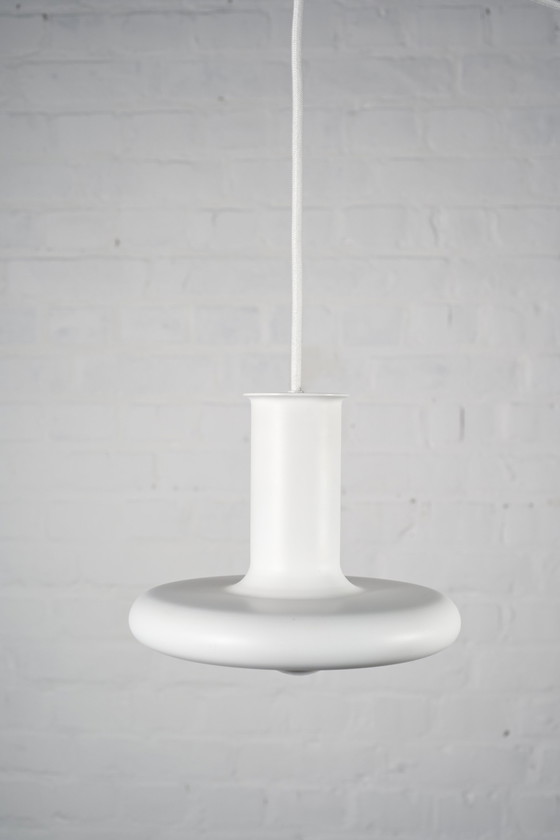 La série de lampes suspendues Optima de Hans Due comprend 3 versions - Optima 5, 6 et 7 en 20cm, 50cm et 60cm respectivement. Elles sont fabriquées en plusieurs couleurs. Celle-ci est la plus petite version en blanc.