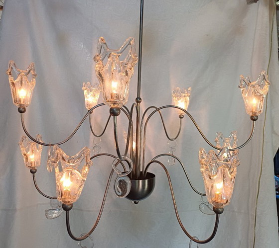 Magnifique lampe Harco Loor design du début de la période, vintage chic. En état neuf. Calices formés à la main, "Flag". Avec 8 ornements séparés. Magnifique dans un hall d'entrée, un loft, ou au-dessus de la table à manger dans une pièce haute. Longueur à partir du plafond 110 cm, peut être rallongée sur demande. Diamètre 83 cm. Lumières halogènes à intensité variable. Poinçon original Harco Loor sur le chapeau de plafond.