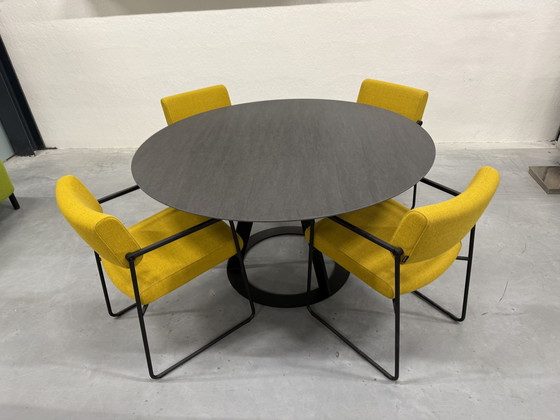 Nouvelle table de salle à manger ronde Harvink Fier avec plateau en basalte céramique satiné. Avec base noire.