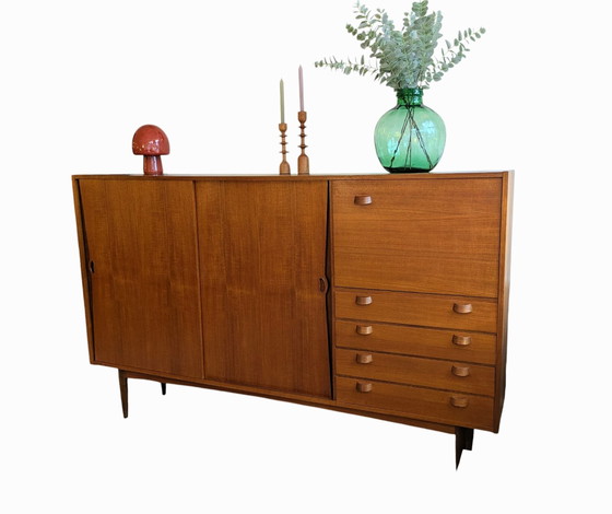 Ce buffet vintage des années 1960 est un magnifique meuble en excellent état. Il ne présente aucune trace d'usure notable. Ce meuble élégant est doté de poignées au design raffiné, tant sur les portes coulissantes que sur les tiroirs. Il offre un espace de rangement généreux.