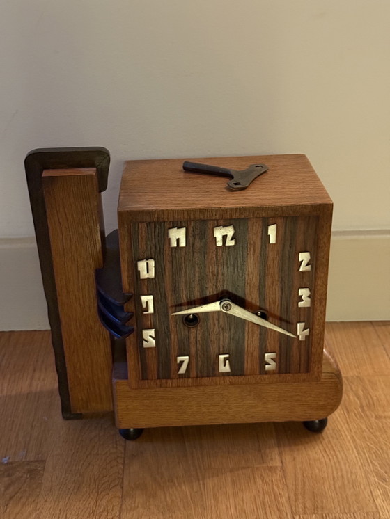 - Elle est dotée d'un boîtier en bois magnifiquement travaillé avec des chiffres en métal complexes, incarnant l'essence même du design Art déco.