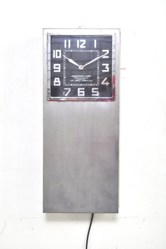 Cette horloge industrielle française date d'environ 1950-1970. Normalement, cette horloge fonctionne avec un pendule (d'où la longueur du boîtier). Malheureusement, le pendule était cassé. Nous avons remplacé le mouvement par un nouveau mouvement synchrone (220V) avec réglage de l'aiguille sur le côté.