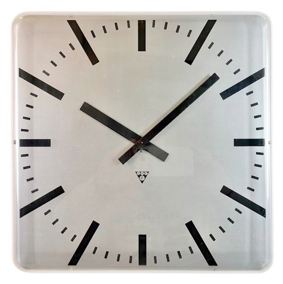 Horloge murale industrielle fabriquée par Pragotron en ex-Tchécoslovaquie dans les années 1980. Elle est dotée d'un cadran carré en aluminium argenté et d'un couvercle en verre transparent incurvé en plastique. Ce mécanisme fonctionne à piles et ne nécessite qu'une seule pile AA. L'horloge pèse 0,5 kg. Des rayures peuvent apparaître sur le couvercle en verre en plastique en raison de son âge.