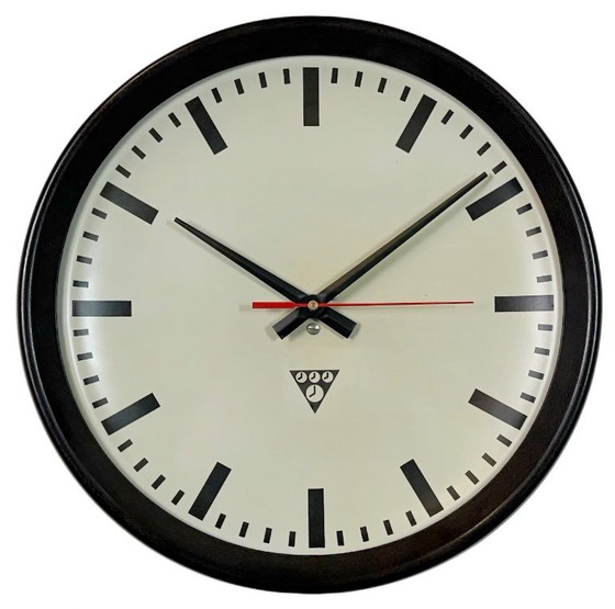 Horloge murale industrielle en bakélite brune de Pragotron, années 1960