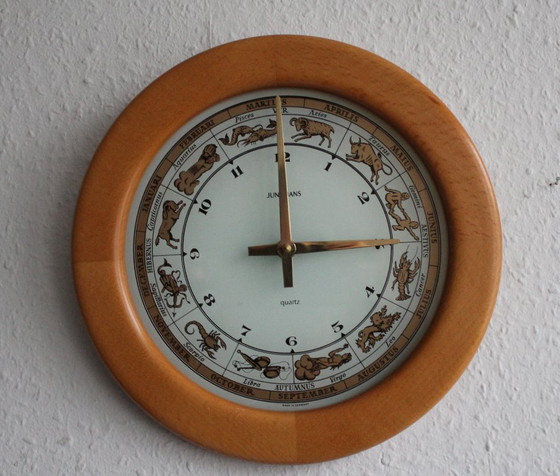 Horloge murale vintage Junghans avec boîtier en bois et signe du zodiaque sur un cadran en verre.