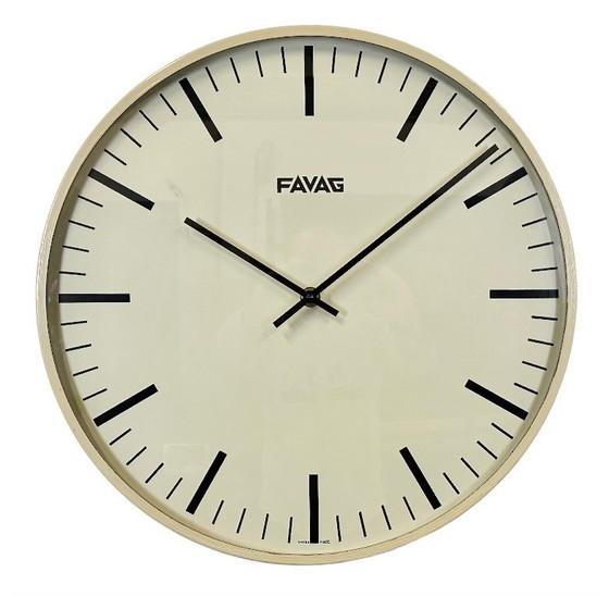 Horloge murale industrielle vintage de la marque Favag, fabriquée en Suisse dans les années 1970. Elle présente un cadre en fer beige, un cadran et des aiguilles en aluminium, ainsi qu'un verre transparent bombé. Ce modèle a été transformé en horloge à piles et ne nécessite qu'une seule pile AA. Dimensions : diamètre 42 cm. Poids : 1,2 kg.