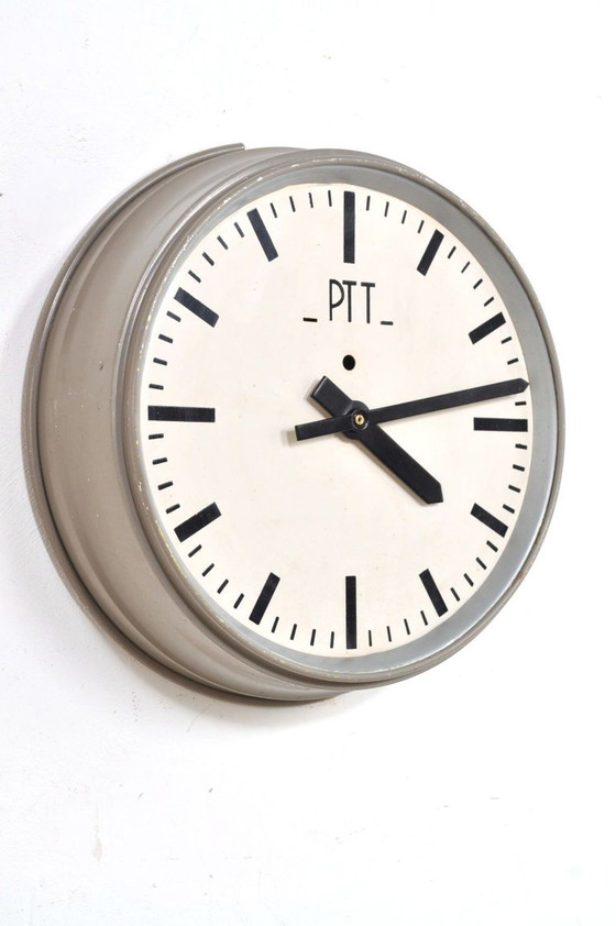 Belle horloge murale des PTT avec un plateau en verre plat, 1960. L'horloge a été convertie en mouvement à quartz (pile), tout en conservant les aiguilles d'origine.