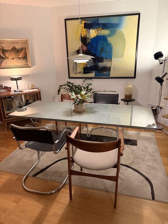 Plongez dans l'univers du design intemporel avec cette table IKEA Vintage signée Niels Gammelgaard. Chef-d'œuvre d'élégance minimaliste, cette table présente un plateau en verre épuré associé à une structure métallique robuste, incarnant l'harmonie parfaite entre forme et fonction. Idéale pour les amoureux de la simplicité, cette pièce témoigne du charme intemporel du design vintage.