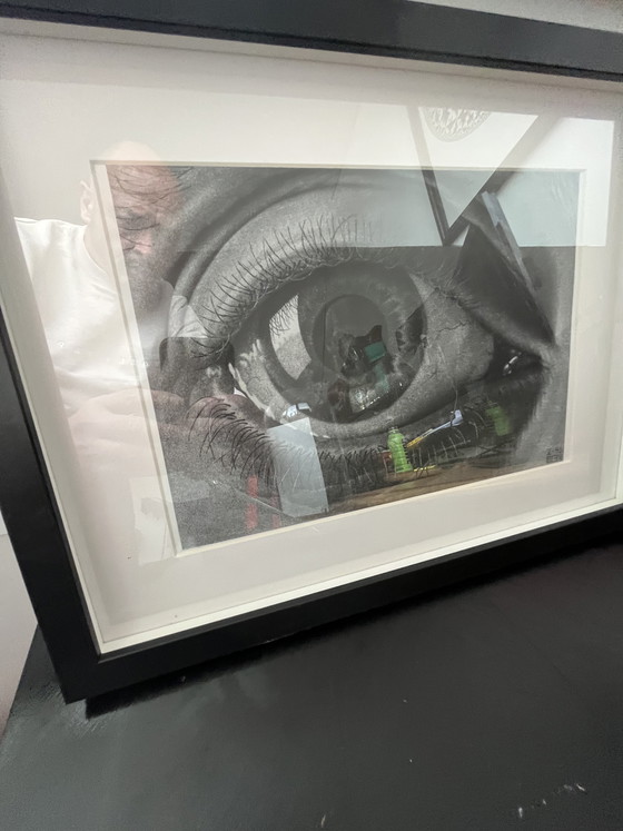 Cette captivante estampe, intitulée « L'Œil d'Escher », est une œuvre saisissante de 35 x 20 cm. Elle présente une représentation hypnotique d'un œil, réalisée dans une palette monochrome qui met en valeur ses détails complexes. Élégamment encadrée de bois noir et protégée par une vitre, l'œuvre apporte une touche de sophistication à tout intérieur moderne.