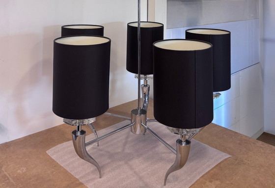 Le lustre Loving Arms H5 d'ILFARI est un luminaire de haute qualité fabriqué en laiton, chromé et avec de belles teintes grises - plus claires que sur la photo. 5x e14 socket 220V Max 40W, dimmable. Sources lumineuses non incluses. Cet article est un modèle d'exposition et l'état est tel que montré dans les photos. Avec des éléments en verre de cristal. ø68cm
