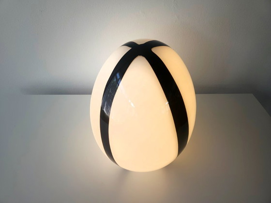 Cette lampe en verre atmosphérique a été fabriquée par Eglo Leuchten, mais la société néerlandaise Ilu Design / Ilu di Vetro a également produit une lampe en verre ovoïde similaire et qualitativement semblable.