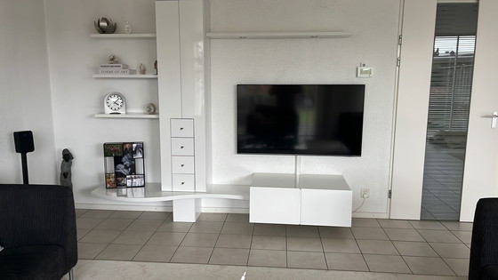 Ce magnifique meuble mural Interstar est en bois massif, laqué blanc brillant, et dispose d'un éclairage LED. Il peut être suspendu ou installé sans son pied (vendu séparément).