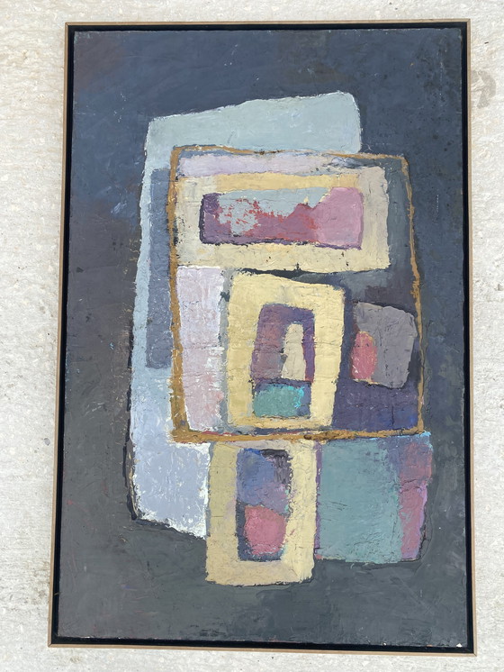 Cette œuvre abstraite se distingue par l'harmonie de ses formes géométriques et ses couleurs subtiles. Elle est composée de rectangles superposés, créant un équilibre entre différentes teintes de bleu, de gris, et des touches de rouge foncé. La surface texturée ajoute une dimension tactile, engageant le spectateur dans une exploration visuelle plus profonde. La juxtaposition audacieuse des couleurs et la simplicité des formes rectangulaires confèrent à la composition une élégance sereine. Le cadre étroit et sombre accentue l'ensemble, soulignant les contrastes et guidant le regard vers le centre de l'œuvre. Cette peinture incite à une réflexion sur l'espace et la couleur, et évoque un sentiment de calme introspectif.