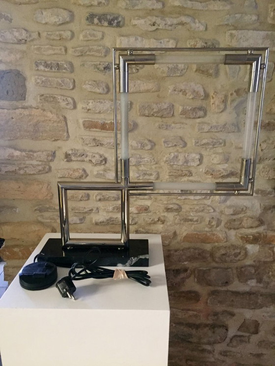 Version ancienne de l'iconique lampe " QUADRO " de Jacques ADNET, tubes à incandescence, marbre noir et structure en nickel chromé, en plus des 4 tubes d'origine, qui équipent cette lampe, il est offert un jeu supplémentaire de 2 tubes.