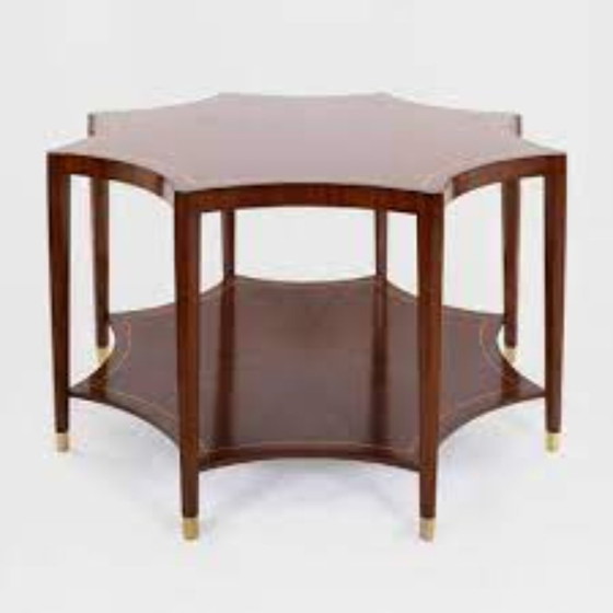 Dimensions : 140 cm de long x 140 cm de large x 90 cm de haut Matériau : Acajou massif avec de magnifiques détails incrustés Design : Hexagonal, avec deux plateaux pour une fonctionnalité supplémentaire Marque : Jansen Furniture - connu pour son artisanat classique et son aspect luxueux