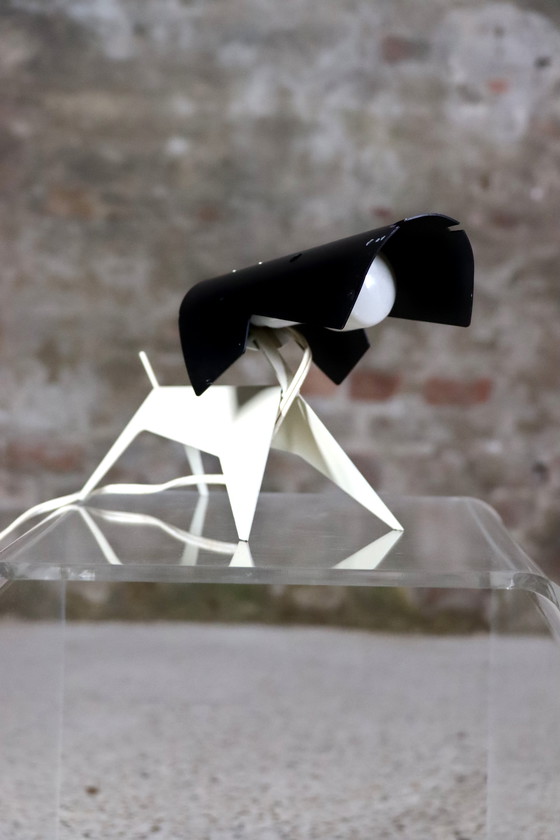 Rare lampe chien conçue par Jean Boris Lacroix et produite par Disderot en France en 1950. Fabriquée en métal plié, cette lampe présente un corps blanc et une tête noire, incarnant une esthétique ludique et minimaliste rappelant celle d'un teckel. Son design charmant et distinctif en fait une pièce remarquable. La lampe est en parfait état d'origine et présente des traces d'usure liées à son âge et à son caractère vintage. Jean-Boris Lacroix (1902-1984) a commencé sa carrière à l'âge de 18 ans, aux côtés de Paul Dumas. De 1924 à 1937, il est directeur artistique de la prestigieuse maison de haute couture Vionnet, où il collabore avec des créateurs de renom tels que J.M. Frank, Pierre Chareau et Jean Dunand.