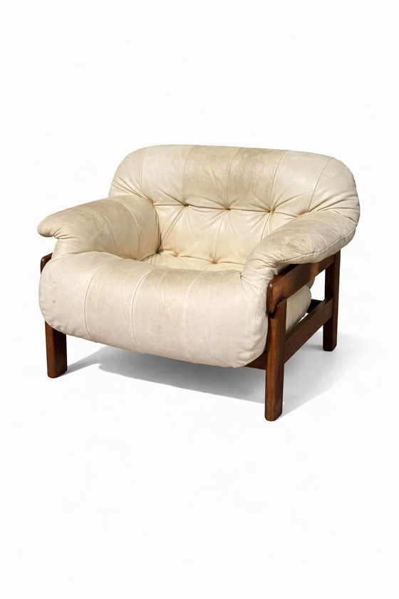 Fauteuil en cuir Jean Gillon. Le cuir présente deux craquelures réparables et nécessite un nettoyage. Projet de restauration.