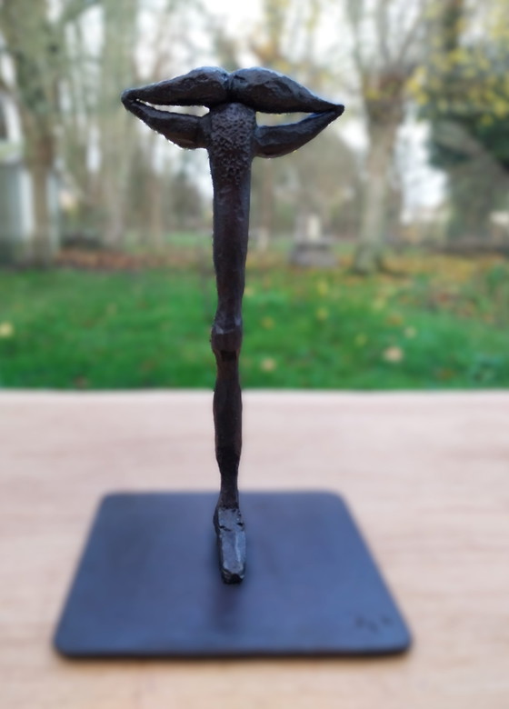 Jean-Luc Bertel Sculptures surréalistes en fer forgé. C'est le lapsus. Le mot prononcé suit son propre chemin. La figure unique et minimaliste a été créée entre le marteau, le feu et l'enclume. La forge est une forme de modelage. Les matériaux et la technique utilisés par l'artiste se fondent complètement dans le résultat. Toutes les sculptures ont un fort coefficient de câlinerie, mais elles sont tellement stratifiées que le spectateur commence presque immédiatement à chercher le message et la relation qu'il entretient avec elle..... La sculpture a reçu un revêtement qui donne à l'objet une belle brillance et une couleur noir-brun et qui accentue les marques de marteau. Œuvre unique signée de 2024. JLB a reçu une formation musicale au Conservatoire de Gand, après quoi il a mené une carrière de corniste, de chef d'orchestre, de compositeur et d'enseignant. Parallèlement, en autodidacte, il s'intéresse à la forge artisanale, d'abord pour restaurer ou fabriquer toutes sortes de ferronneries à l'ancienne. Plus tard, il découvre les possibilités de réaliser des sculptures. Après une rencontre et un court stage avec Martin Granel, il découvre la combinaison du verre et du fer. JLB expose régulièrement à la salle Garemyn à Bruges. Son travail a également été exposé à la galerie Vlask à Gand. Dimensions : 25x16x13 cm