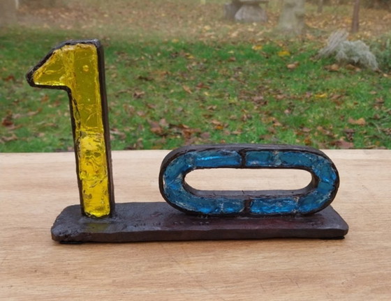 Les chiffres 1 et 0, forgés au feu, sont remplis de verre coloré dans la masse, coulé artisanalement (Albertini), d’une épaisseur de 2 cm. Le verre a été taillé à la main. Les matériaux et les techniques employés par l’artiste sont pleinement intégrés à l’œuvre. Chaque sculpture est très tactile, et pourtant si riche en strates que le spectateur est presque immédiatement amené à rechercher le message et à établir un lien avec elle. La sculpture a été recouverte d’un vernis lui conférant un magnifique éclat et une couleur brun-noir. Œuvre unique, signée, datant de 2025. Dimensions : 28 × 17 × 6 cm